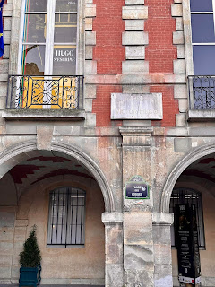 Place des Vosges, nổi bật bởi những bức tuờng màu đỏ, bao bọc chung quanh công viên. Nhà của Victor Hugo trong góc .
